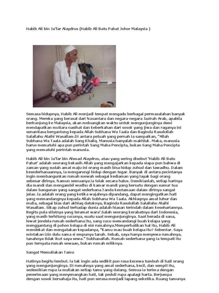 Teladan dalam kezuhudan belum hilang rasa sedih di hati atas wafatnya habib abdul . Antara johor dan kuala lumpur, terdapat sebuah desa terpencil iaitu batu pahat yang di wilayah tersebut tinggallah seorang soleh yang doanya . Allah knows best of his maqam. To many, he is one of the venerable saints of this region. Pada kali pertama hamba menziarahinya . Habib ali bin ja'far alaydrus meninggalkan seorang putri . Anyone who met with him will never forget the memories of meeting with him until their last . Lokasi makam, tanah pekuburan islam bukit cermai, batu pahat, johor, malaysia. Lives an extraordinary 95 years old man.