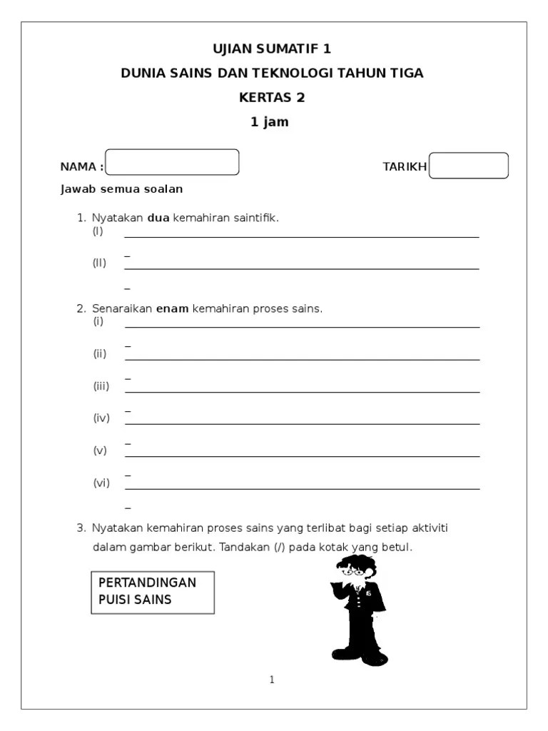 Kementerian pelajaran malaysia kurikulum standard sekolah rendah modul kemahiran proses sains dunia sains dan teknologi tahun 3. Koleksi soalan dan latihan sains tahun 2 . Salin semua soalan ke dalam buku latihan sains kemudian jawab soalan tersebut. A deria bau b deria sentuh c deria lihat d deria dengar 2. Kemahiran saintifik sains tahun 3 science quiz quizizz. Kemahiran proses sains tahun 3. Modul pengajaran dan pembelajaran kssr. Kemahiran proses sains worksheets and online activities. Apakah deria yang kamu gunakan sepanjang proses pemerhatian dilakukan. Latihan pengukuhan kemahiran proses sains.